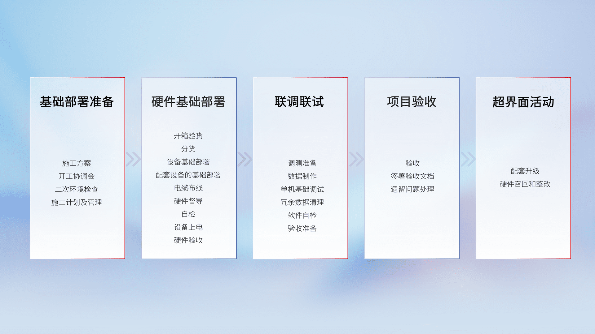 从基础部署准备、、、、硬件基础部署、、联调联试、、、、项目验收、、、越界面活动的全过程可追溯,,保证施工质量和进度。。。